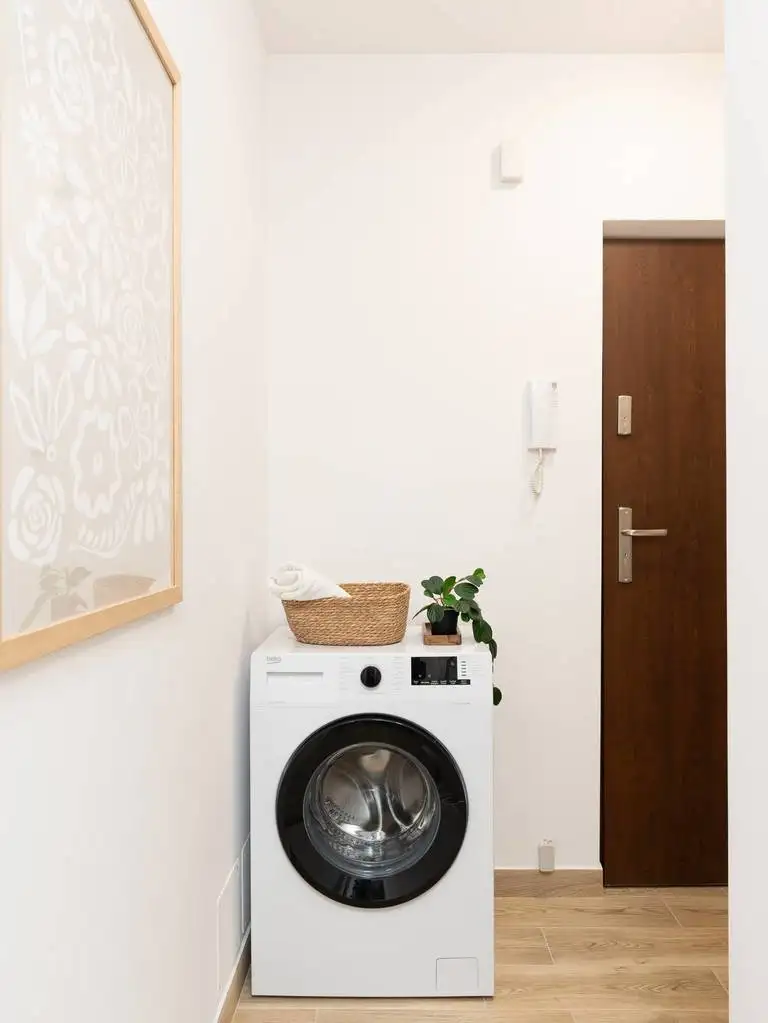 Na wyposażeniu mieszkania jest płyta indukcyjna, kuchenka mikrofalowa, lodówka, podstawowe akcesoria kuchenne (talerze, sztućce itp.), pralka, żelazko, deska do prasowania.