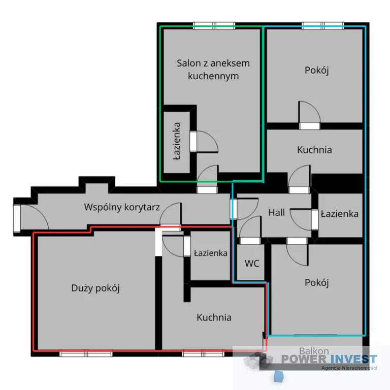 mieszkania, każde z własną kuchnią i łazienką, połączone wspólnym korytarzem. To doskonałe rozwiązanie pod wynajem krótkoterminowy lub długoterminowy, gwarantujące prywatność i komfort dla każdego lokalu.