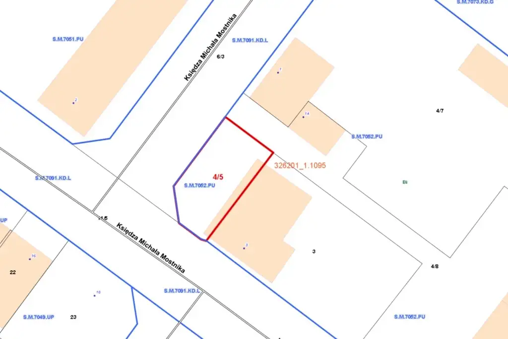 2) Ulica Ks. Michała Mostnika jest drogą publiczną zaliczoną do kategorii dróg gminnych. W celu obsługi komunikacyjnej od strony ulicy Ks. Michała Mostnika należy wybudować zjazd. Przed wybudowaniem zjazdu należy uzyskać zezwolenie zarządcy drogi w drodze decyzji administracyjnej. Na części działek numer: 6/3 i 11/5 z obrębu numer 1095, na których położona jest ul. Ks. Michała Mostnika znajdują się krzewy i drzewa. Z uwagi na bezpieczeństwo ruchu oraz uwarunkowania terenowe, obsługa komunikacyjna zbywanej nieruchomości powinna odbywać się poprzez zjazd z ul. Ks. Michał Mostnika położony na działce numer 6/3 z obrębu numer 1095.