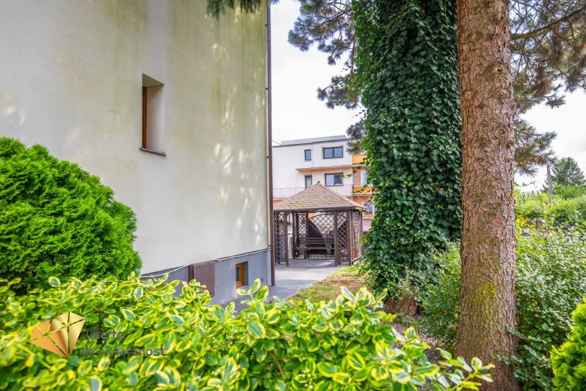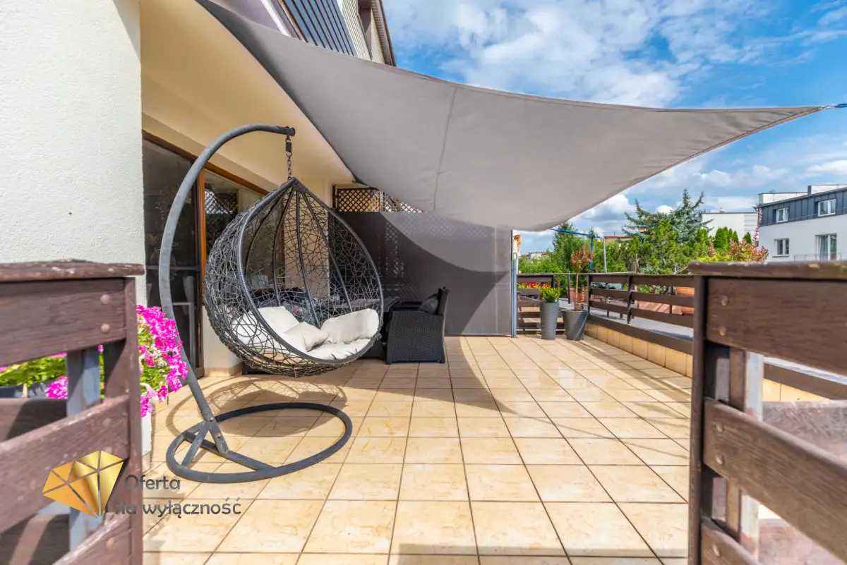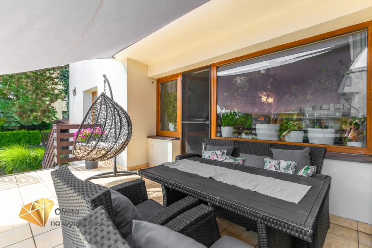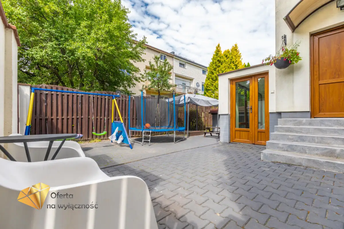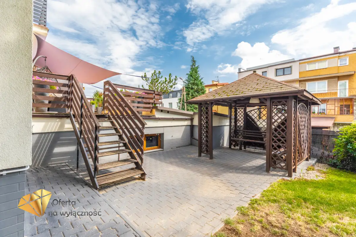 Do relaksu zachęca przestronny taras, który stanowi doskonałe miejsce do spędzania czasu na świeżym powietrzu. Na zewnątrz znajduje się także drewniana altana ogrodowa. Wszystkie ciągi piesze oraz opaska wokół domu zostały wykonane z kostki, co dodaje ogrodowi nie tylko elegancji, ale i trwałości.