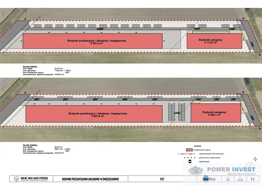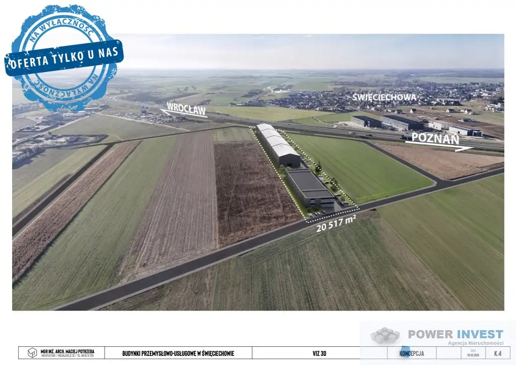 centrum logistyczne (np. obiekt last mile delivery),magazyny wysokiego składowania,park handlowo-usługowy,hala produkcyjna lub lekka produkcja,siedziba firmy z biurami i zapleczem magazynowym,centrum serwisowe / warsztatowe,park technologiczny dla mniejszych najemców.Dysponujemy dwoma wstępnymi wariantami koncepcji zabudowy opracowanymi dla tej działki, które prezentują potencjał inwestycyjny terenu. Duża powierzchnia działki oraz 70% dopuszczalnej zabudowy pozwalają na realizację obiektów o łącznej powierzchni użytkowej nawet ok. 12–14 tys. m² (zależnie od wybranej koncepcji i projektu). Szczegóły tych koncepcji oraz pełna dokumentacja planistyczna są dostępne dla zainteresowanych inwestorów.