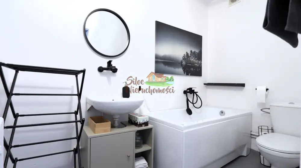 Łazienka z WC - wanna, umywalka z lustrem, pralka, szafka i półki