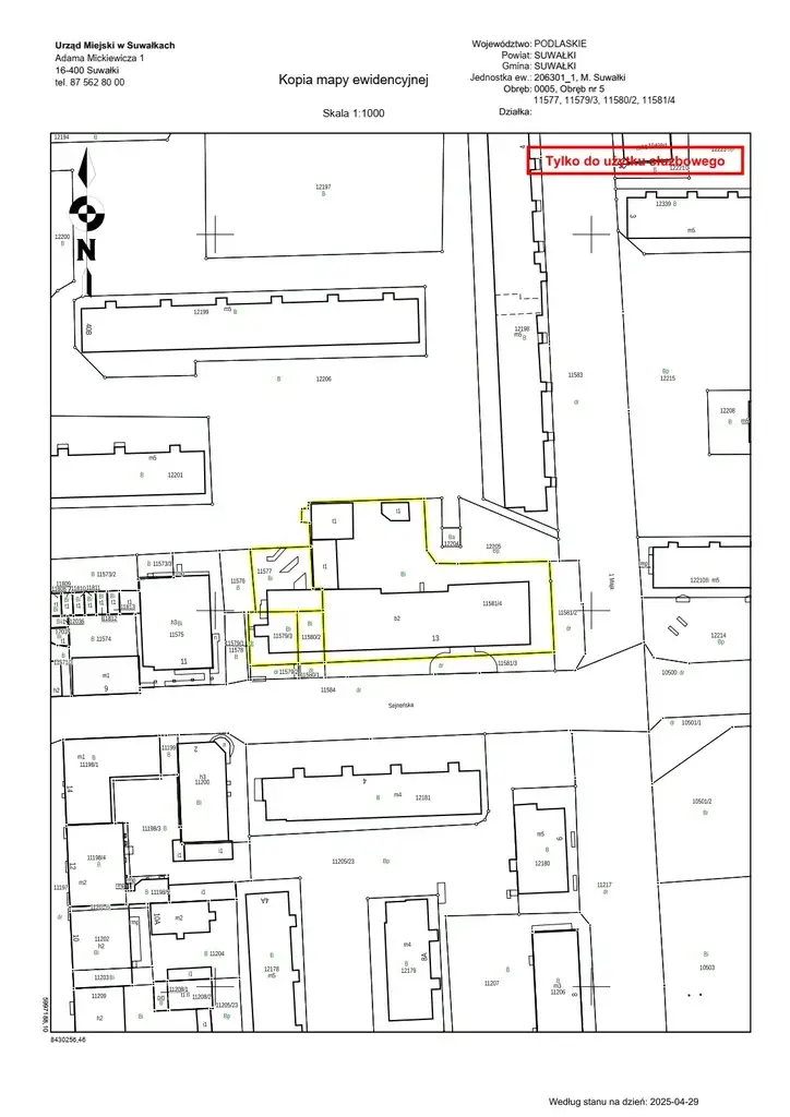 1. Nieruchomość stanowiąca własność Miasta Suwałk, oznaczona działką nr geod. 11581/4 o powierzchni 0,2071 ha, położona przy ul. Sejneńskiej 13 w Suwałkach, dla której prowadzona jest księga wieczysta nr SU1S/00027728/7. Nieruchomość jest zabudowana budynkiem administracyjno-biurowym, dwukondygnacyjnym, podpiwniczonym o powierzchni zabudowy 1129 m² i powierzchni użytkowej 1661,50 m². Ponadto na działce usytuowane są dwa garaże o łącznej pow. zabudowy 192 m² i powierzchni użytkowej 182,65 m² oraz śmietnik o pow. zabudowy 33 m² i pow. użytkowej 12,21 m². Na działce zlokalizowane są sieci: kanalizacji sanitarnej i deszczowej oraz przyłącza: wodociągowe, elektroenergetyczne niskiego napięcia i telekomunikacyjne. Nabywca zobowiązany będzie do nieodpłatnego znoszenia tych sieci i przyłączy oraz nieodpłatnego udostępniania wejścia na grunt w przypadku ich awarii bądź konserwacji.