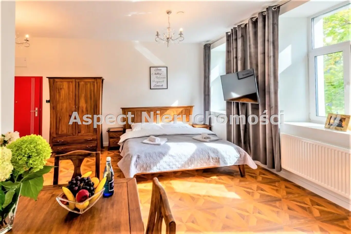 Mieszkanie ma funkcjonalny rozkład oraz ponadstandardową wysokość kondygnacji, dzięki czemu daje poczucie komfortu i przestrzeni. Urządzone jest w stonowanych szarościach i bieli, z dodatkiem ciepłego drewna. Jest w pełni umeblowane : szafa, duże łóżko z wygodnym materacem, stół i krzesła oraz zabudowa w aneksie kuchennym. Mieszkanie wyposażone jest w niezbędne urządzenia AGD i RTV tj. lodówka, zmywarka, pralka, płyta ceramiczna, kuchenka mikrofalowa, czajnik elektryczny, okap, telewizor.
