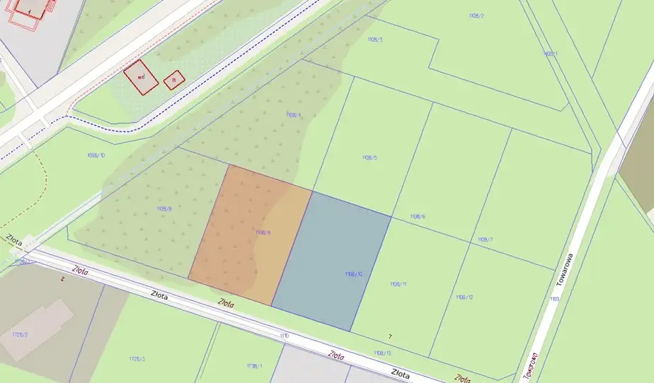 Działki nr 1108/9 oraz 1108/10 położone są w strefie nowopowstającej zabudowy jednorodzinnej Drezdenka przy ul. Złotej. Dojazd do nieruchomości drogą gruntową. Działki nie są uzbrojone – znajdują się w strefie uzbrojenia w energię elektryczną, wodociąg miejski i gaz. Kształt działek jest regularny, teren równy. Teren działek porośnięty drzewami i krzakami. Wycinkę drzew reguluje ustawa z 16 kwietnia 2004 r. o ochronie przyrody.