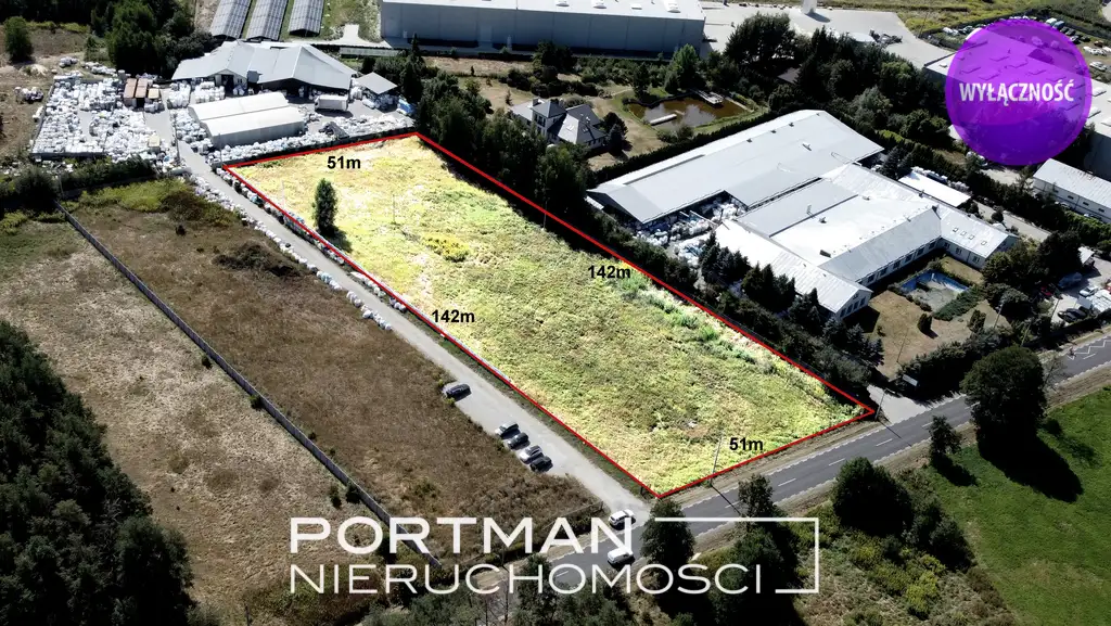 Nieruchomość o powierzchni 7100 m² w kształcie prostokąta o wymiarach 51 x 142 m zlokalizowana przy głównej drodze (wjazd z drogi asfaltowej), ogrodzona z trzech stron. Klasyfikacja gruntów: PsV i PsVI.