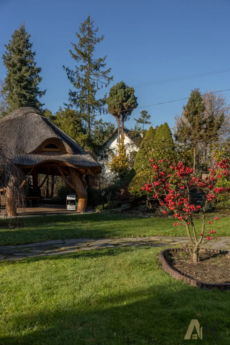Powierzchnia działki 19 arów, płaska, w całości budowlana. W ogrodzie  znajduję się oczko wodne, duża altana ogrodowa oraz dwa tarasy. Teren ogrodzony z kamienia, siatki oraz desek.
