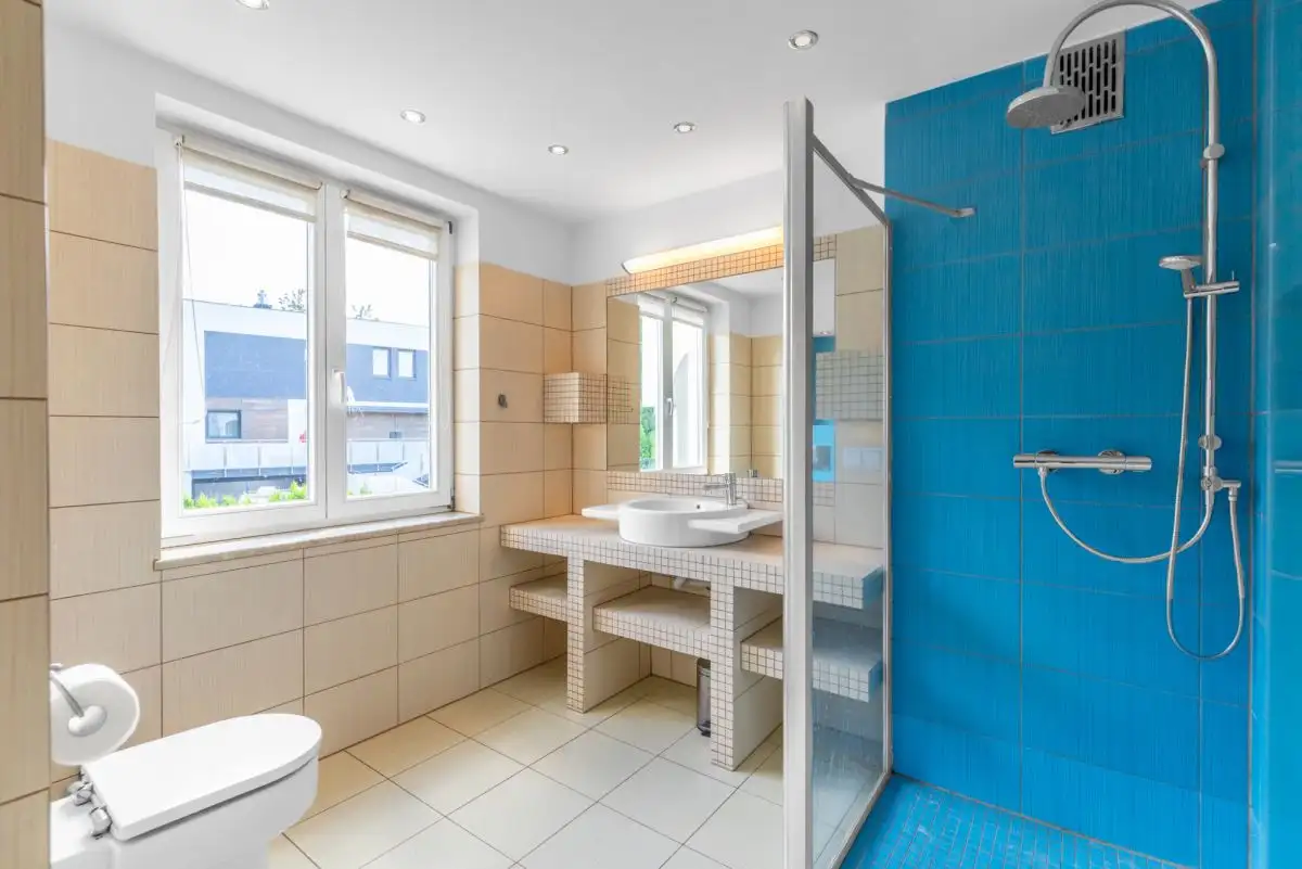 Łazienka z kabiną prysznicową, umywalką i toaletą.
