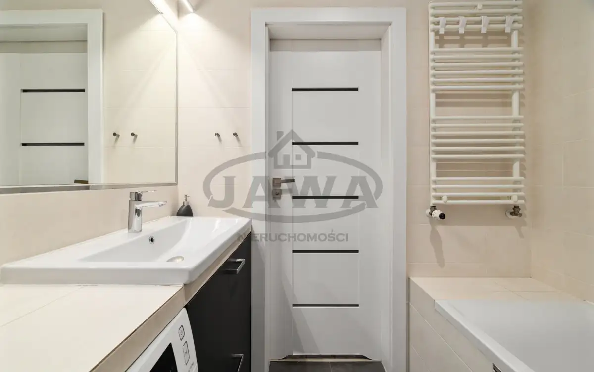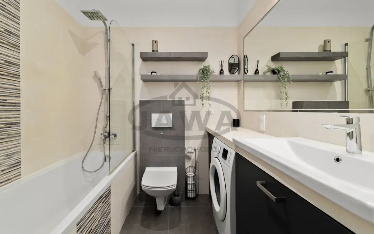 Łazienka - choć niewielka, została urządzona niezwykle praktycznie i estetycznie. Zmieściła wszystko, co potrzebne do komfortowego użytkowania: wannę, toaletę, pralkę oraz pojemne szafki łazienkowe, które zapewniają wystarczającą ilość miejsca do przechowywania. Jasne wykończenia i przemyślana aranżacja sprawiają, że pomieszczenie jest przytulne i funkcjonalne.