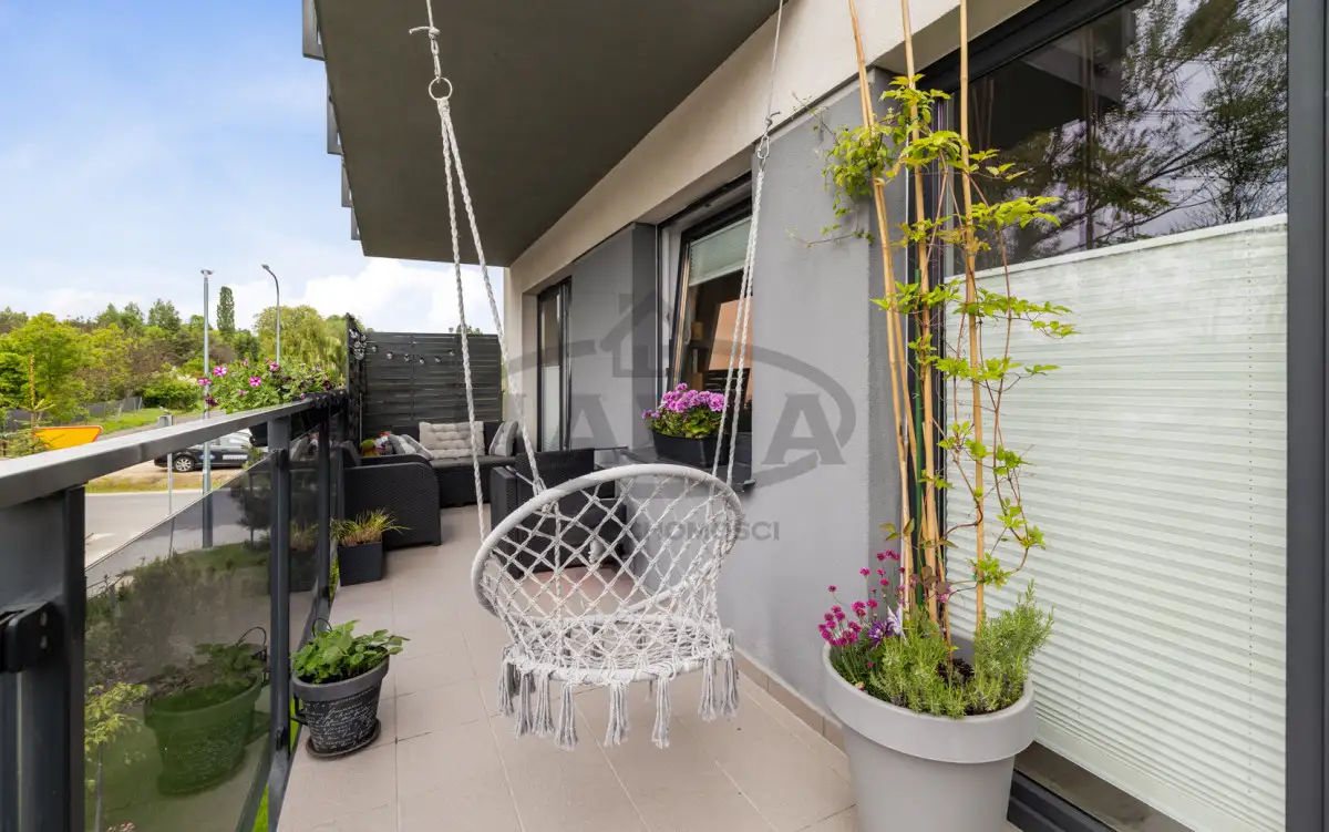 Dzięki dużym oknom pomieszczenie jest dobrze doświetlone a przyjemne chwile na świeżym powietrzu można spędzać na ponad