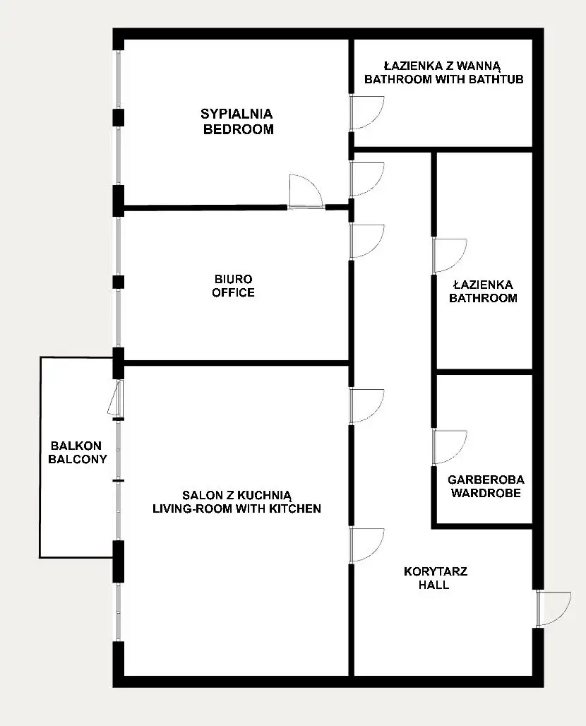 Pokoje: 2 Sypialnie, garderoba, salon, otwarta kuchnia, korytarz, łazienka z wanną, łazienka z prysznicem, balkon