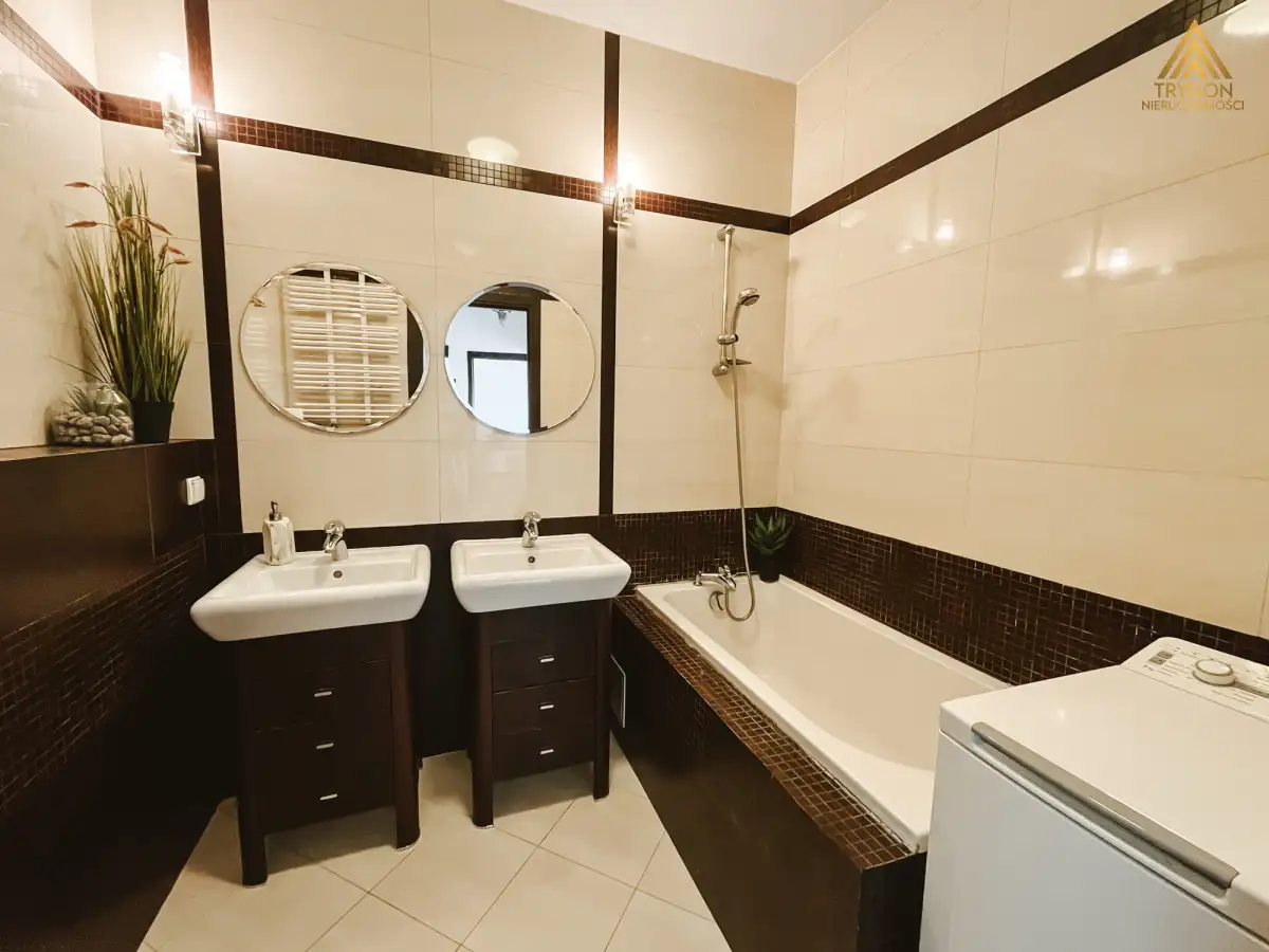 W łazience znajdują się dwa zlewy, toaleta, wanna z prysznicem oraz pralka.