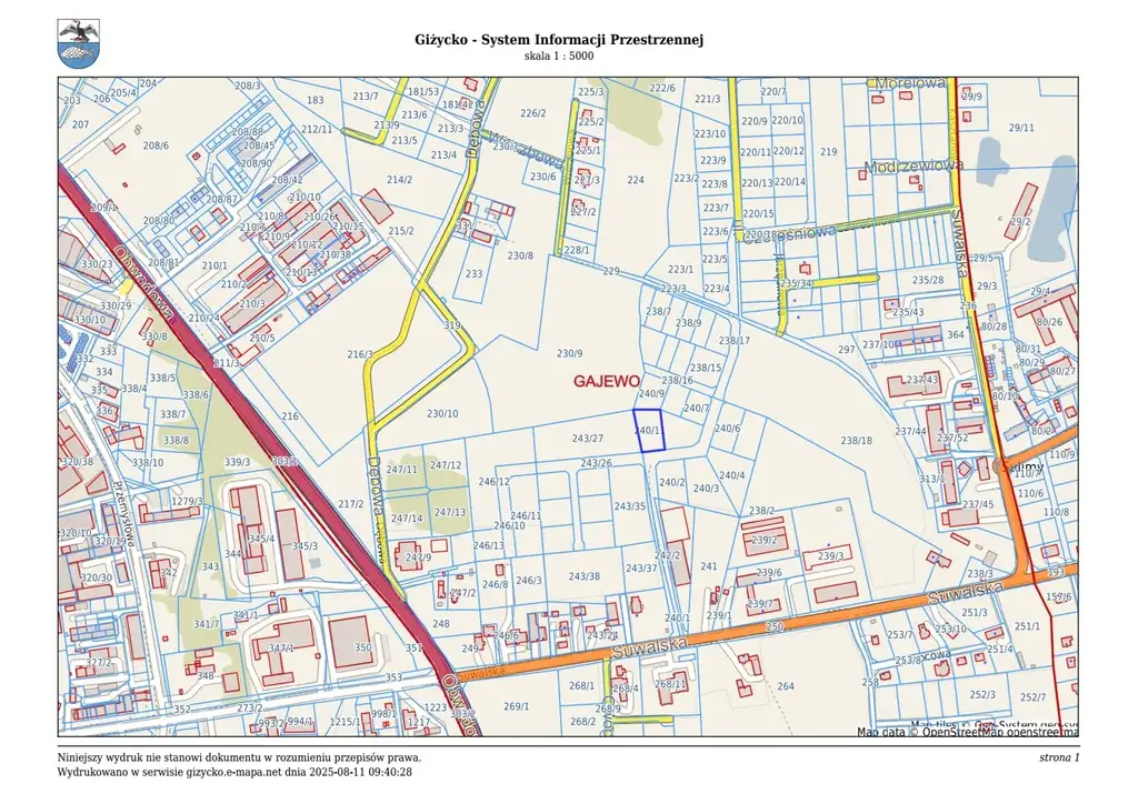 1) 240/11 o powierzchni 0,1774 ha, położona w miejscowości Gajewo, obręb geodezyjny Gajewo, gmina Giżycko dla której Sąd Rejonowy w Giżycku prowadzi księgę wieczystą OL1G/00016906/1. Wg ewidencji Gruntów i Budynków Starostwa Powiatowego w Giżycku działka oznaczona jest symbolem: RIVb, RV – grunty orne.