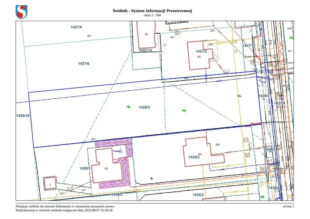 Wzdłuż północnej granicy działki nr 1428/3 na całej jej długości przebiega sieć wodociągowa, w odległości 10 metrów od wschodniej granicy działki z północy na południe przebiega sieć gazowa, natomiast w południowej części działki na długości 5 metrów zlokalizowana jest sieć energetyczna.