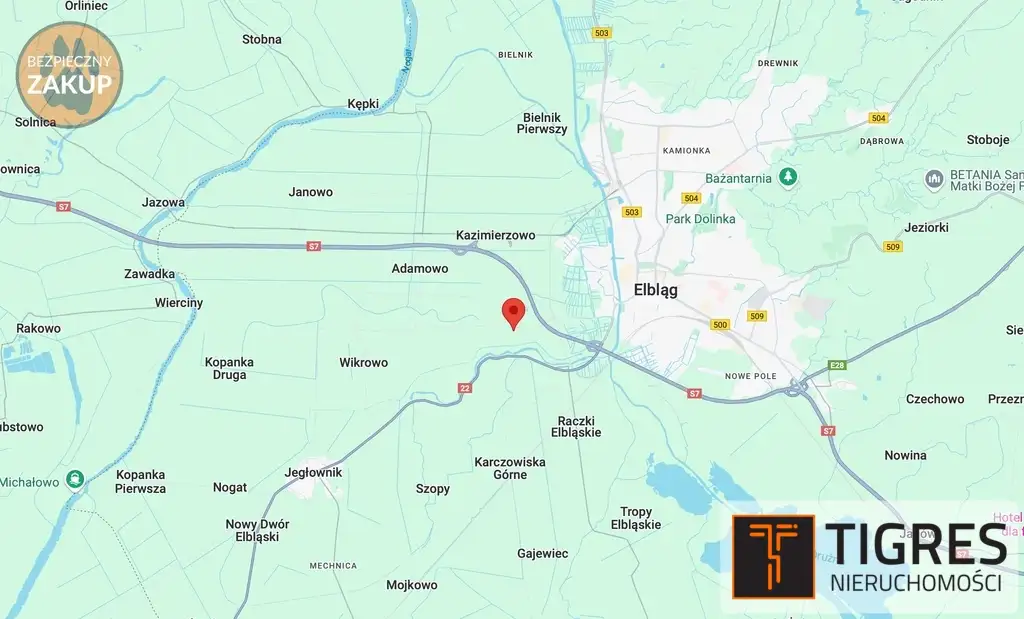 Nieruchomość położona jest w miejscowości Władysławowo, gmina Elbląg, województwo warmińsko-mazurskie. To spokojna, zielona okolica z przewagą zabudowy jednorodzinnej. W bezpośrednim sąsiedztwie płynie rzeczka Fiszewka, co dodatkowo podnosi walory przyrodnicze terenu. Lokalizacja zapewnia balans między dostępem do infrastruktury miejskiej Elbląga a spokojem terenów podmiejskich. Dojazd do nieruchomości odbywa się poprzez wytyczone działki drogowe.