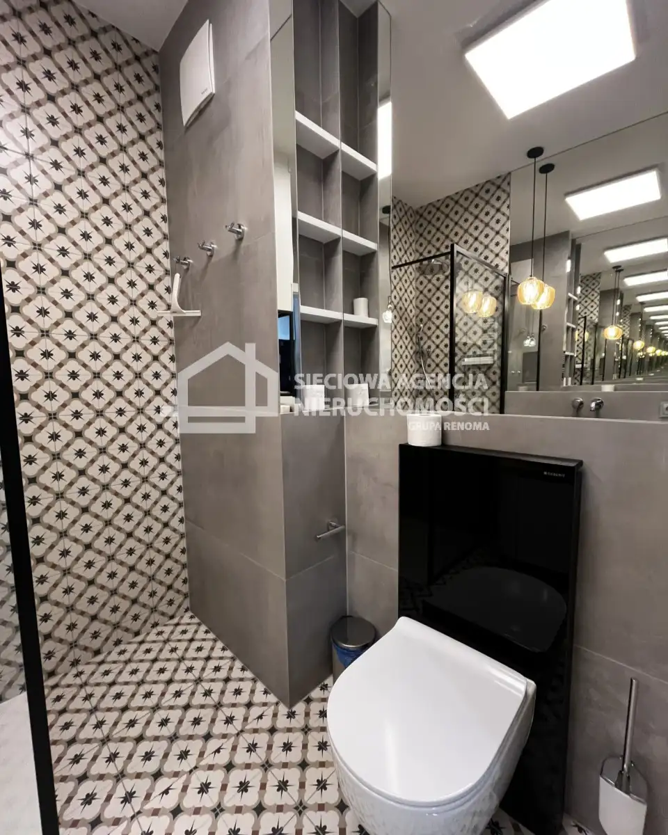 Nieruchomość składa się z: salonu z aneksem kuchennym, sypialni z dużą szafą w zabudowie, łazienki z kabiną prysznicową i WC oraz przestronnego przedpokoju.