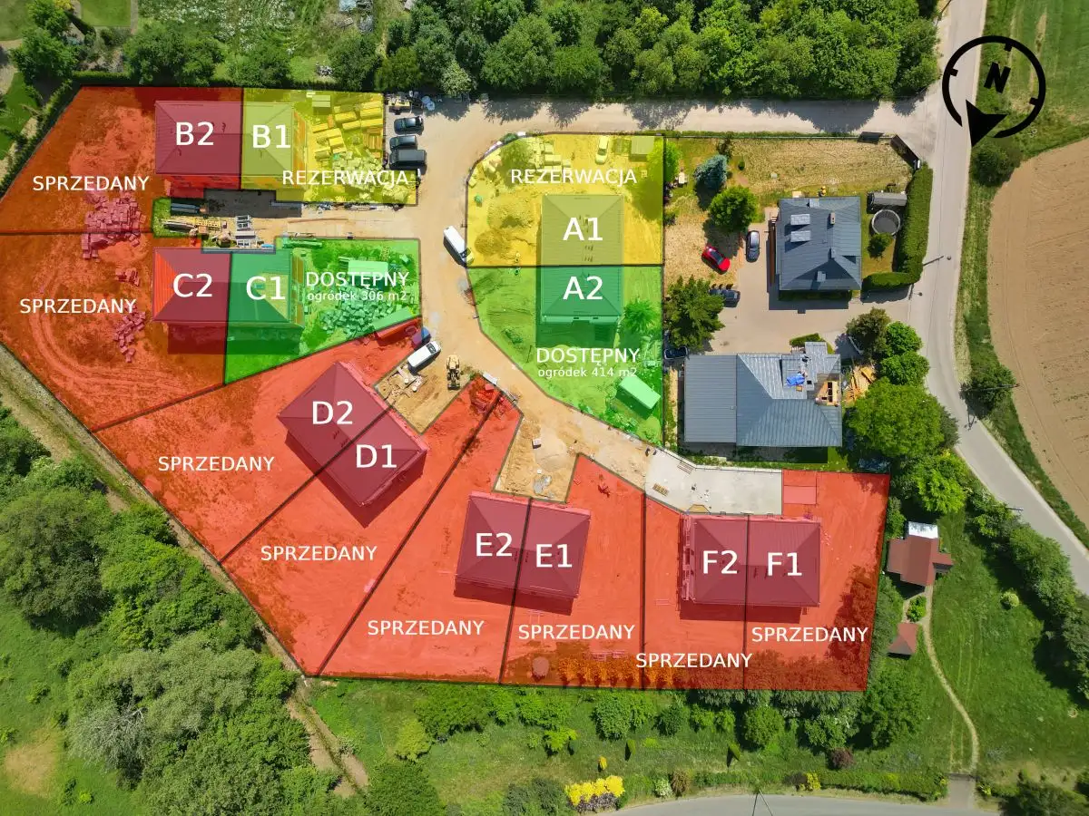 Each house has a private fenced garden with a green area between 290 m² and 1062 m². The indicated areas do not include the land under the building and the land under the reaching road (white paved square in front of each building).