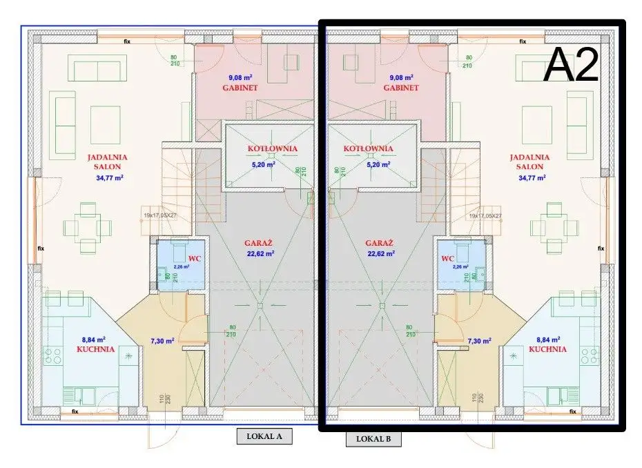 Każdy budynek posiada 2 kondygnacje, na których znajdują się: