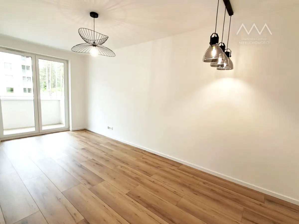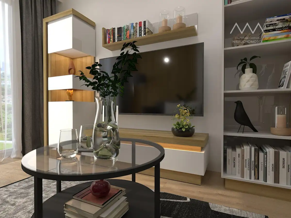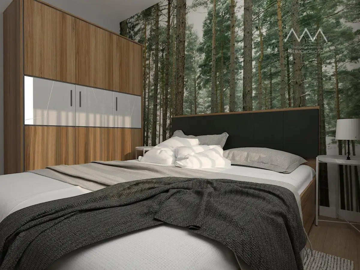 Wnętrze zostało zaprojektowane tak, by oddać klimat miejsca - kolory natury, stonowana paleta barw inspirowana lasem, okna z widokiem na zieleń oraz przemyślane detale tworzą harmonijną całość. W salonie znajdziesz przestrzeń na sofę i stół, kuchnia została wykończony w neutralnych kolorach. Sypialnia sprzyja wyciszeniu - zieleń za oknem i przytulne wykończenie tworzą idealne miejsce do odpoczynku.