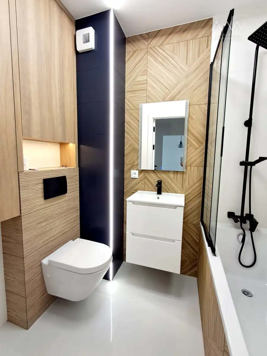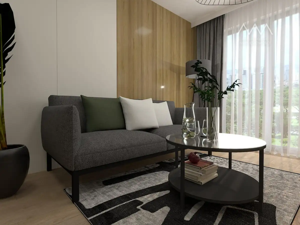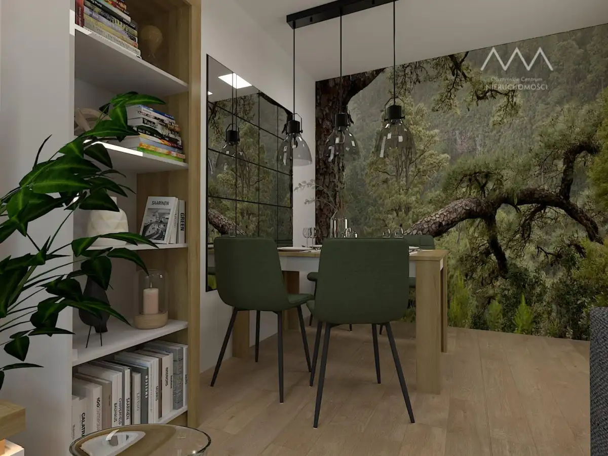 Wnętrze zostało zaprojektowane tak, by oddać klimat miejsca - kolory natury, stonowana paleta barw inspirowana lasem, okna z widokiem na zieleń oraz przemyślane detale tworzą harmonijną całość. W salonie znajdziesz przestrzeń na sofę i stół, kuchnia została wykończony w neutralnych kolorach. Sypialnia sprzyja wyciszeniu - zieleń za oknem i przytulne wykończenie tworzą idealne miejsce do odpoczynku.