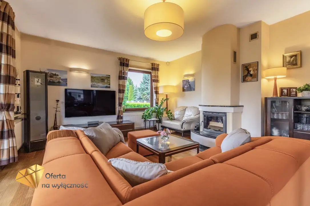 • salon z kominkiem (dystrybucja gorącego powietrza), jadalnią i wyjściem na zadaszony taras z widokiem na ogród