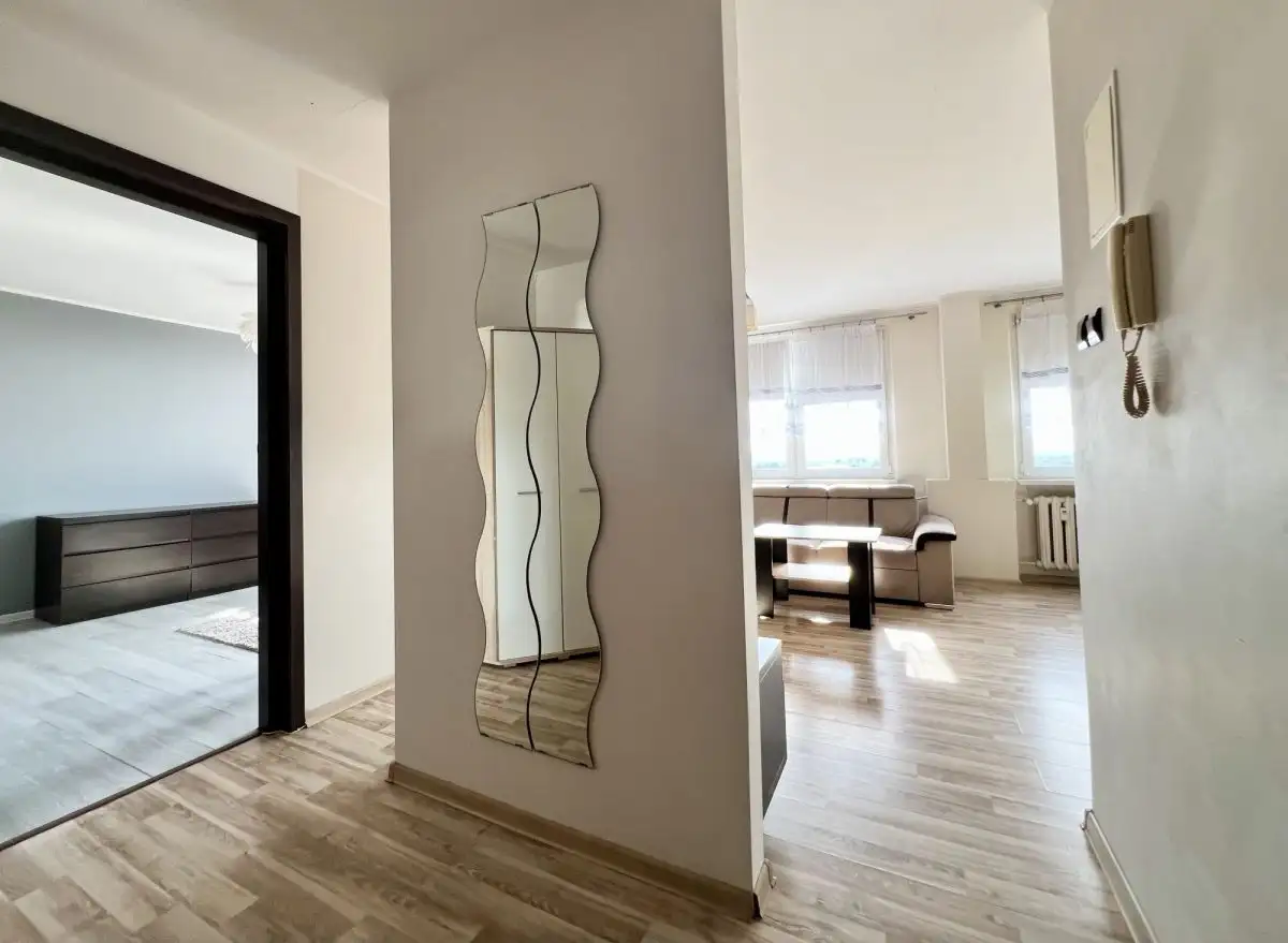 Rozkład i powierzchniaMieszkanie o powierzchni 42,90 m² charakteryzuje się nowoczesnym, otwartym układem przestrzeni. Salon połączony z aneksem kuchennym tworzy przestronną strefę dzienną, idealną do codziennego życia i przyjmowania gości. Istnieje możliwość powrotu do tradycyjnego układu z zamkniętą kuchnią, co daje elastyczność aranżacji. Druga sypialnia zapewnia prywatność i komfort wypoczynku. Balkon stanowi dodatkową przestrzeń, z której można podziwiać imponujący widok na miasto i okolicę. Do mieszkania przynależy także piwnica.