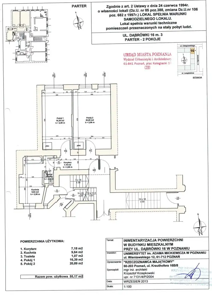 - lokal mieszkalny nr 5 w budynku przy ul. Dąbrówki 13, usytuowany na I piętrze budynku mieszkalnego wielorodzinnego o łącznej powierzchni użytkowej 69,04 m², składający się z: 2 pokoi, kuchni, toalety i korytarza, dla którego Sąd Rejonowy Poznań - Stare Miasto w Poznaniu prowadzi księgę wieczystą nr KW PO2P/00301700/8, a także udział w wysokości 6904/468655 w częściach wspólnych budynku oraz w prawie własności gruntu, oznaczonego w ewidencji gruntów jako działka nr 65, ark. mapy 15, obręb Wilda, o powierzchni 0,1095 ha oraz działka nr 74, ark. mapy 15, obręb Wilda, o powierzchni 0,1102 ha, dla których prowadzona jest księga wieczysta nr KW PO2P/00101206/3. Dział III (obciążenia i ograniczenia) i Dział IV (hipoteki) księgi wieczystej nr PO2P/00301700/8, nie zawiera wpisów.