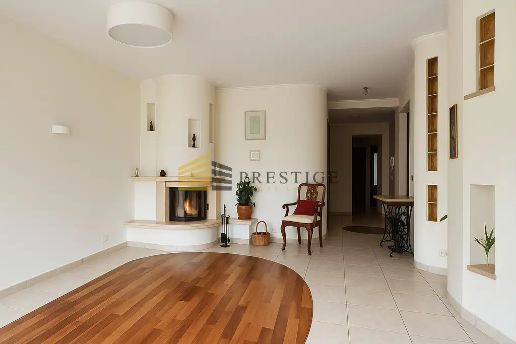 Spacious living room with fireplace and access to a large terrace Dining room connected to a semi-open, bright kitchen Fully equipped kitchen: fridge, oven, hob, dishwasher, hood 2 bedrooms (one with balcony) 2 bathrooms + dressing room + small laundry room Additional wardrobe next to the bedroom A large number of windows – excellent interior lighting Cooling system, anti-burglary door, video intercom Unfurnished Building amenities: