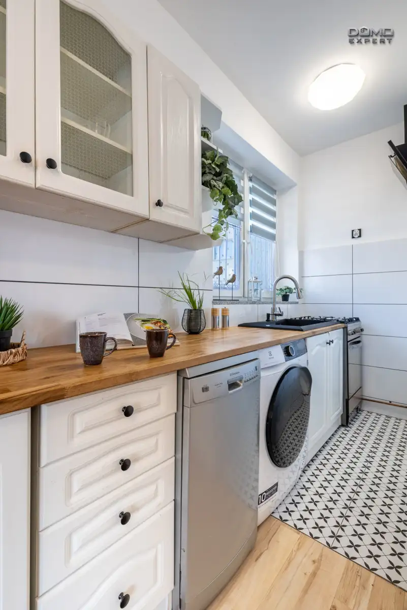 Lokal wyposażony w sprzęty AGD: pralko-suszarkę, zmywarkę oraz lodówkę.