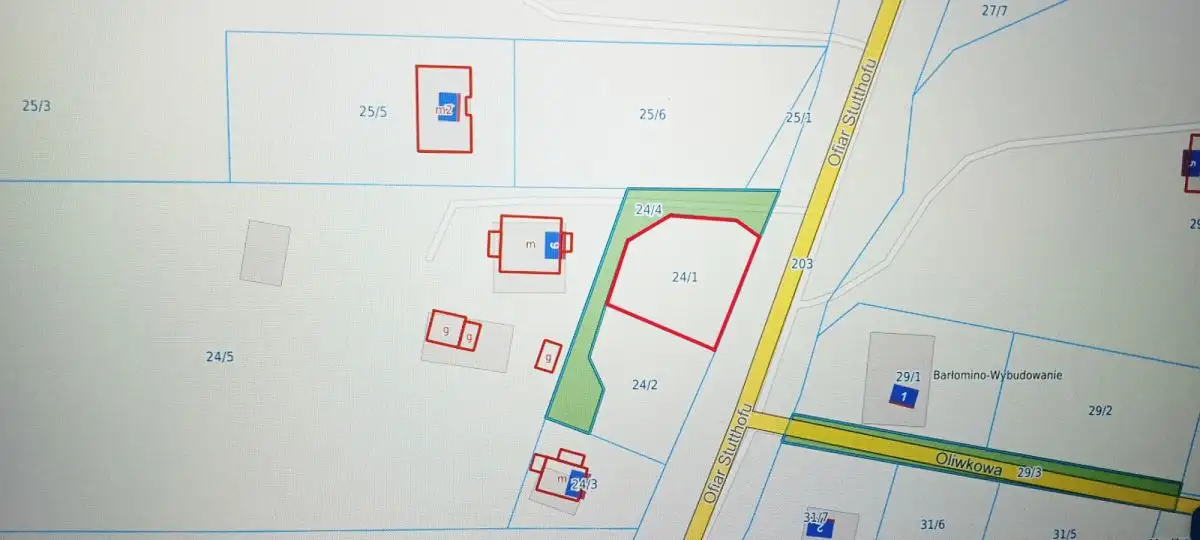 Działka pod zabudowę o powierzchni 504 m², położona w Barłominie, w gminie Luzino, w powiecie wejherowskim, (nr ewidencyjny 24/1), przy ul. Ofiar Stutthofu.