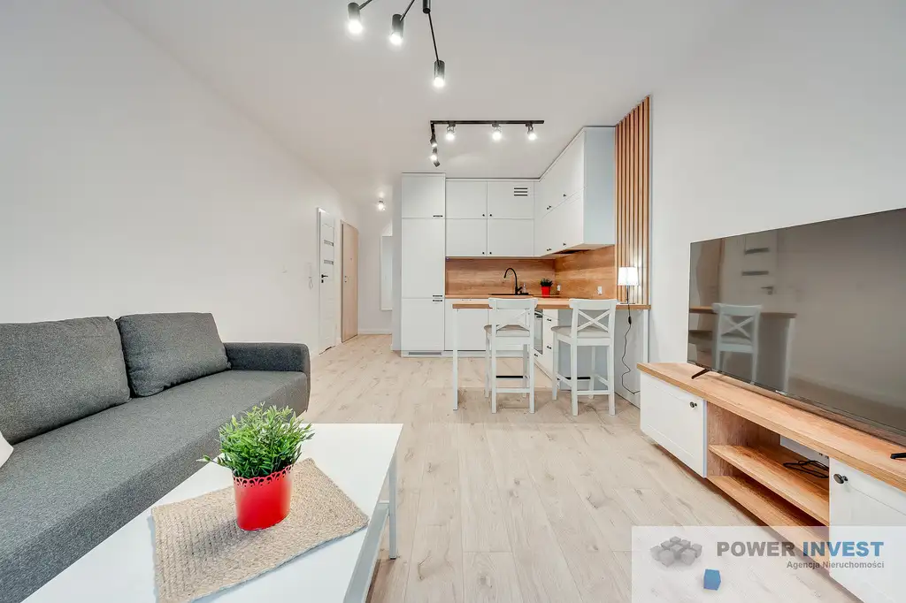 Przestronna kawalerka z aneksem kuchennym z wyspą, łazienka. Do mieszkania przynależy balkon.