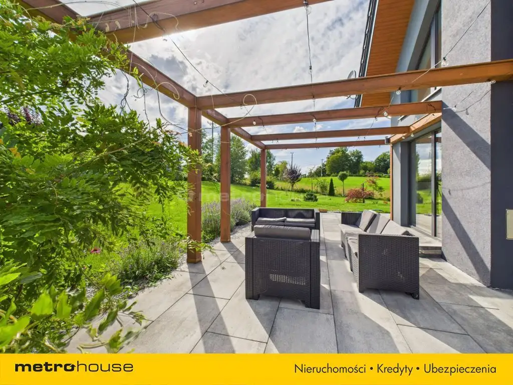 Dzięki dużym przeszkleniom, dom jest bardzo słoneczny, co sprawia, że wnętrza są jasne i przyjemne. Dom wyposażony w wysokim standardzie. Na zewnątrz znajduje się przestronny ogród, idealny do relaksu i wypoczynku na świeżym powietrzu, rozciągający się na pięknie zagospodarowanej działce, która stanowi również wybieg dla psów i dzięki temu nie ma kretów na działce.