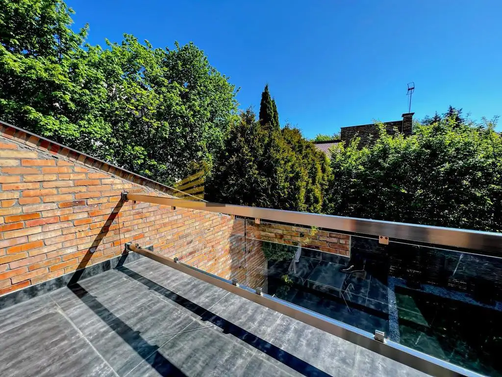 Ground floor with an area of 109.72m², which includes: Living room with fireplace with an area of 37m², fully furnished, with a view of the garden and a large window with a Venetian mirror effect. From the living room there is an exit to the terrace and the garden. Large, original and fully equipped, kitchen and dining room with direct access to the heated terrace (15.18m²) Spacious hall with large built-in wardrobes, with an area of 16.79m² Study/guest room with an area of approx. 10m² Guest toilet with a hidden utility room (laundry room, drying room). Exotic wood board on the floors.