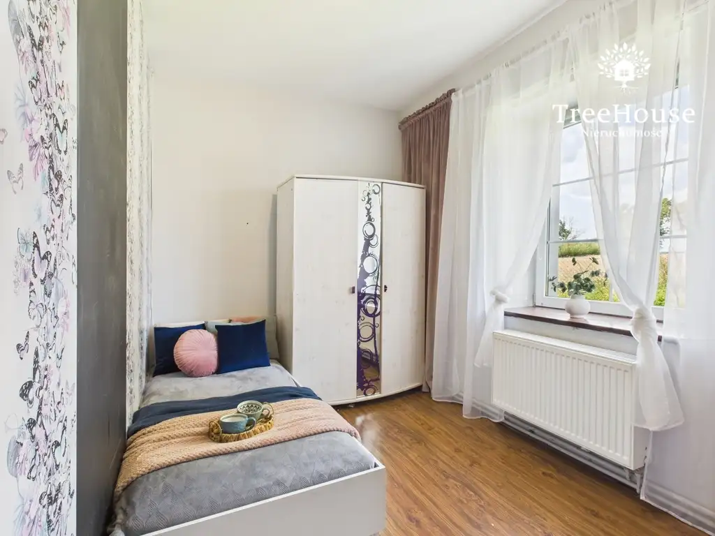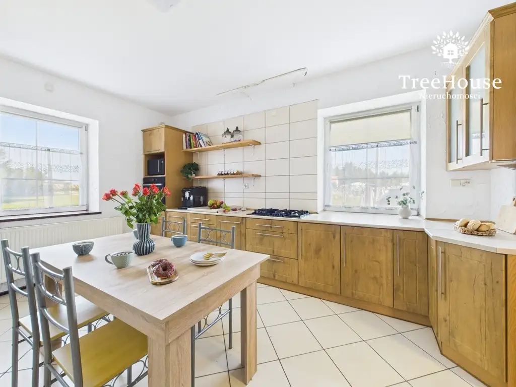 Funkcjonujący dom mieszkalny z wydzieloną częścią agroturystyczną. Budynek posiada dwa niezależne wejścia – co daje duże możliwości podziału przestrzeni według potrzeb (np. strefa prywatna + gościnna lub dwie niezależne jednostki).