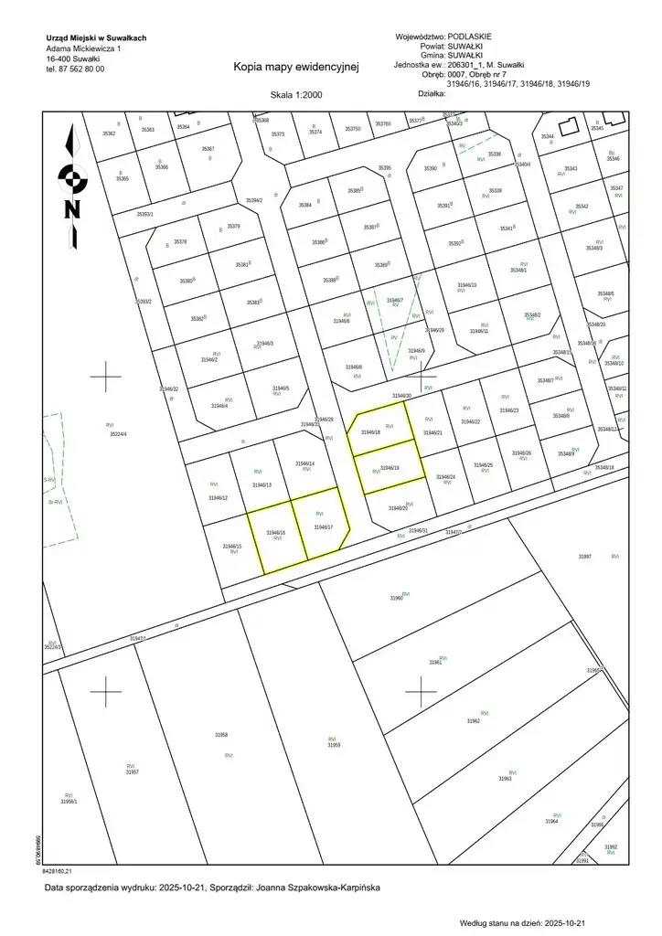 1. Oznaczona działką nr 31946/16 o powierzchni 0,1159 ha, niezabudowana, położona w Suwałkach w Obrębie nr 7, wchodząca w skład nieruchomości oznaczonej księgą wieczystą nr SU1S/00031671/3. Działka zgodnie z miejscowym planem zagospodarowania przestrzennego południowo - zachodniego rejonu ulicy Zastawie w Suwałkach zatwierdzonym Uchwałą LXVI/871/2024 Rady Miejskiej w Suwałkach z dnia 31.01.2024 roku, objęta jest konturem 6MNW - teren zabudowy mieszkaniowej jednorodzinnej wolnostojącej. Nieruchomość przeznaczona jest do sprzedaży w drodze przetargu ustnego nieograniczonego.