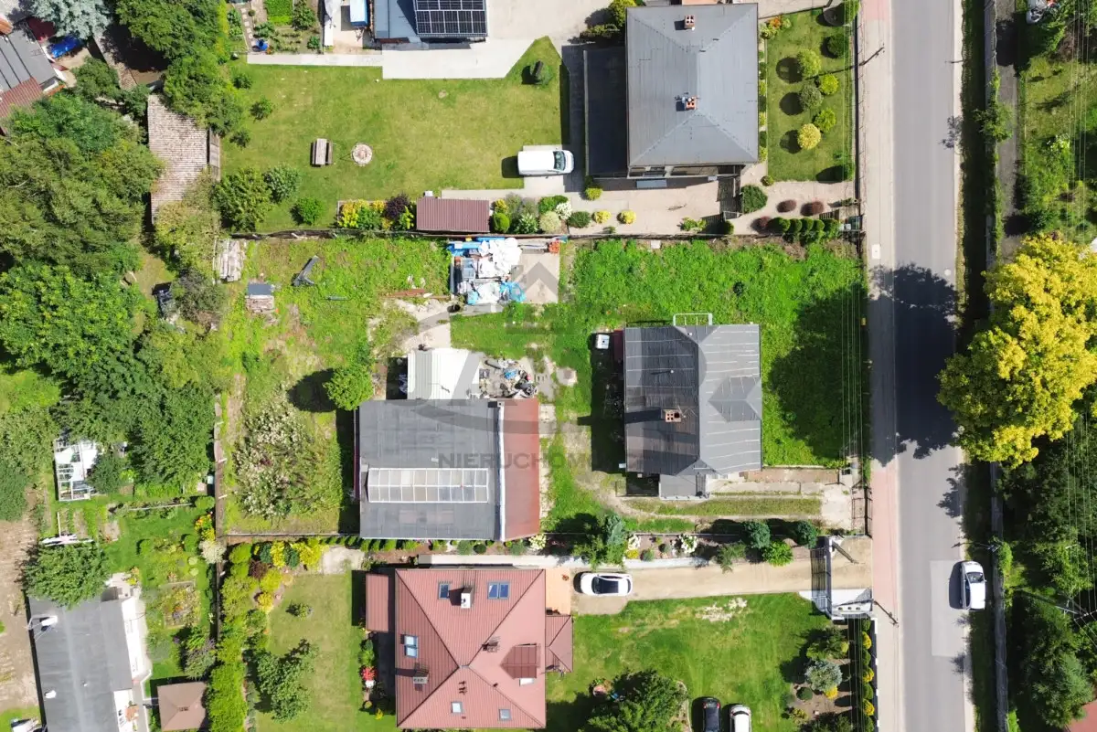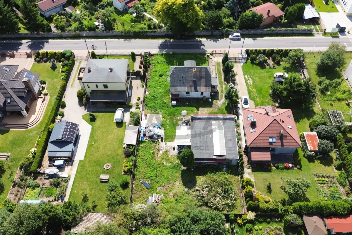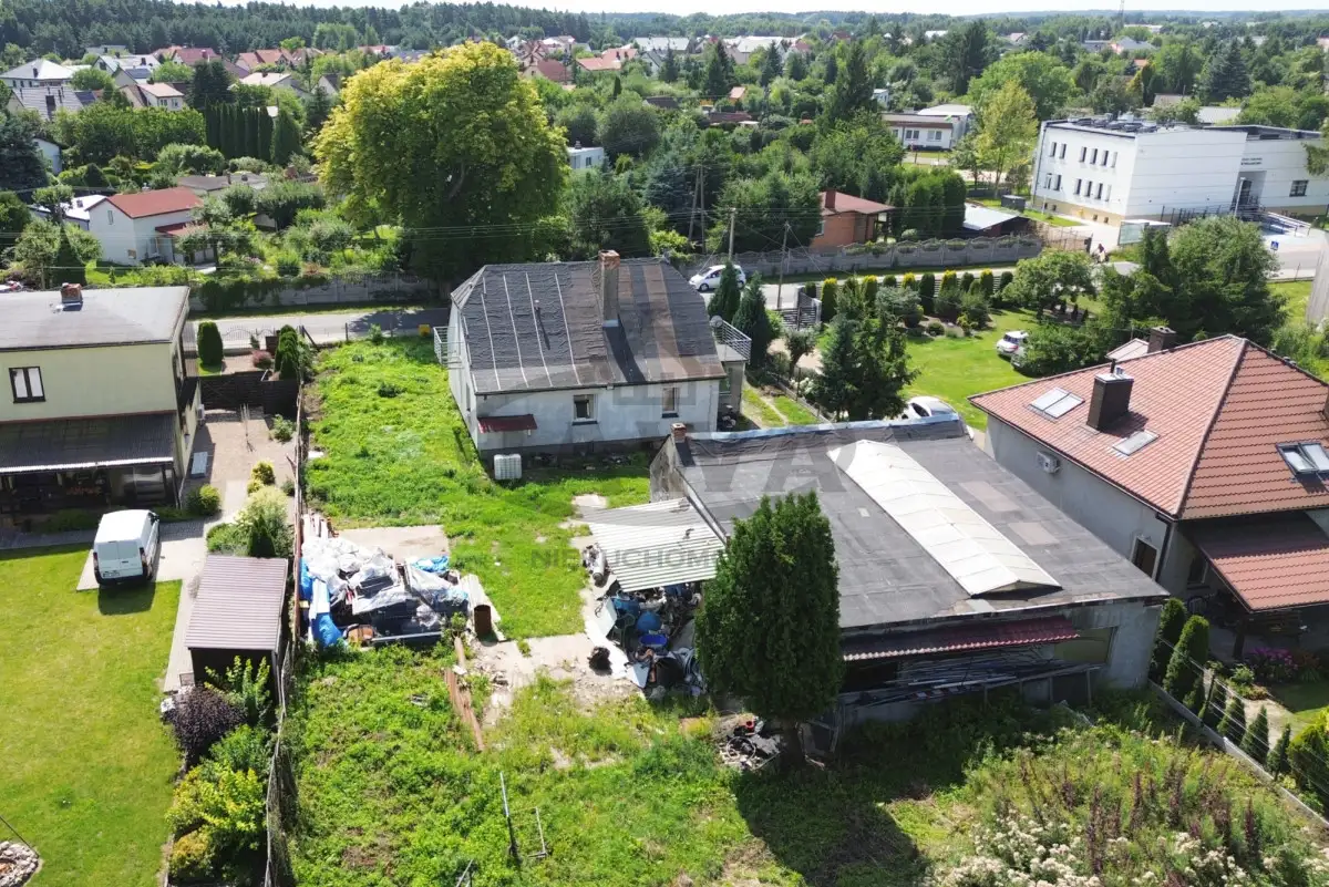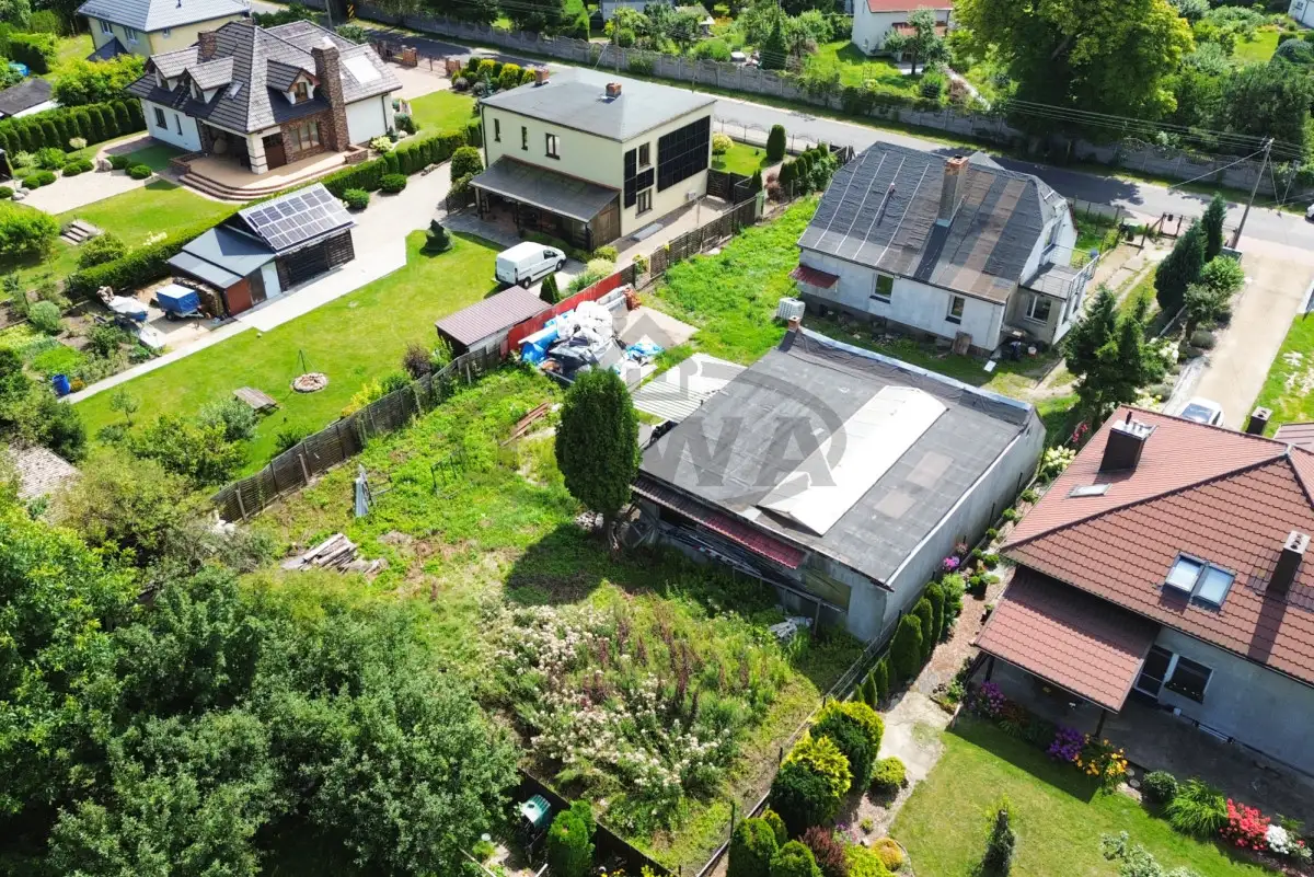 Działka 1364 m² - ogrodzona, z budynkiem gospodarczym (dawna pieczarkarnia, obecnie warsztat).