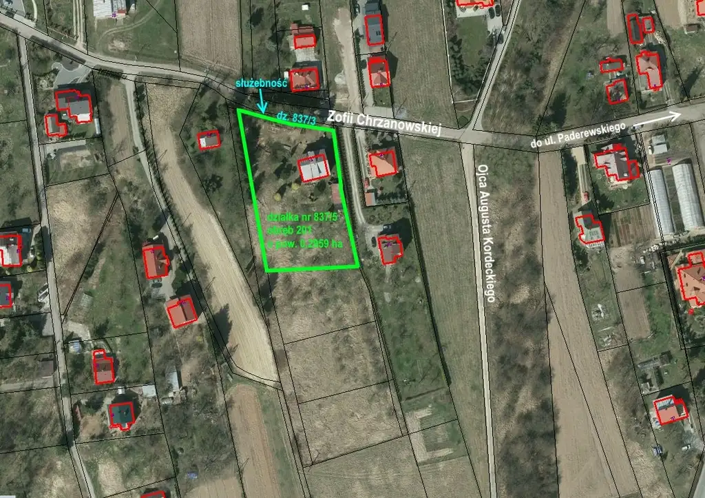 3. Opis nieruchomości: Działka nr 837/5 w obrębie 201 posiada regularny kształt, zbliżony do rombu. Teren nieruchomości płaski, porośnięty drzewami różnych gatunków, krzewami, oraz zielenią nieurządzoną. Działka nr 837/5 nie przylega bezpośrednio do drogi publicznej. Dojazd do ul. Zofii Chrzanowskiej odbywać się będzie przez działkę nr 837/3 w obrębie 201, przeznaczoną na poszerzenie tej ulicy. Z tego względu ustanowiona zostanie odpłatna służebność gruntowa przechodu i przejazdu przez działkę nr 837/3 w obrębie 201, na rzecz każdoczesnych właścicieli działki nr 837/5 w obrębie 201. Jednorazowe wynagrodzenie z tytułu ustanowienia ww. służebności w wysokości 6 500,00 zł (słownie: sześć tysięcy pięćset złotych 00/100) brutto (w tym 23% VAT) Nabywca nieruchomości będzie zobowiązany uiścić nie później niż do dnia zawarcia aktu notarialnego umowy sprzedaży. Działka nr 837/3 od strony ulicy ogrodzona jest trwałym ogrodzeniem, przy czym ogrodzenie nie pokrywa się z granicą działki. Przez teren działki będącej przedmiotem sprzedaży przebiega napowietrzna linia niskiego napięcia. Do budynku doprowadzona jest sieć wodociągowa i gazowa, a przed budynkiem znajduje jest studnia. Ponadto przez działkę biegną dwa gazociągi „DN200” i „DN250”, a szerokości stref kontrolowanych wynoszą odpowiednio 10 m i 15 m w obie strony od osi gazociągów.