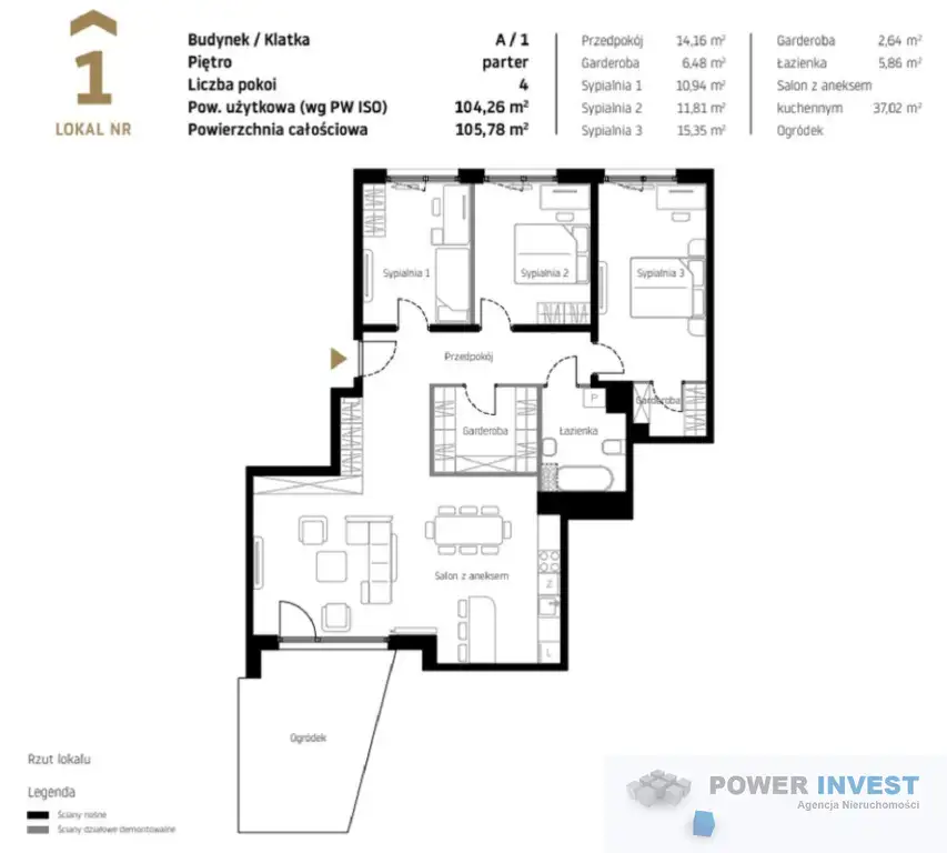 Przedpokój – 14,16 m² Garderoba – 6,48 m² Sypialnia 1 – 10,94 m² Sypialnia 2 – 11,81 m² Sypialnia 3 – 15,35 m² Garderoba – 2,64 m² Łazienka – 5,86 m² Salon z aneksem kuch. – 37,02 m² Ogródek