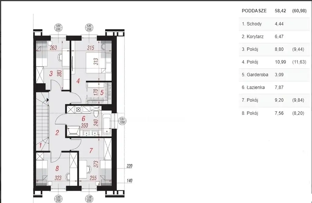 - Dodatkowa powierzchnia strychowa ok. 40 m² z możliwością adaptacji (np. montaż stałych schodów lub wyłazu)