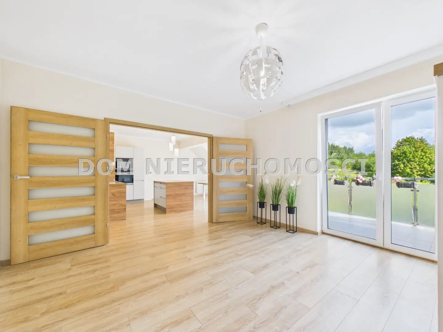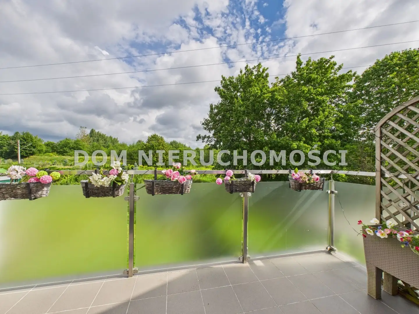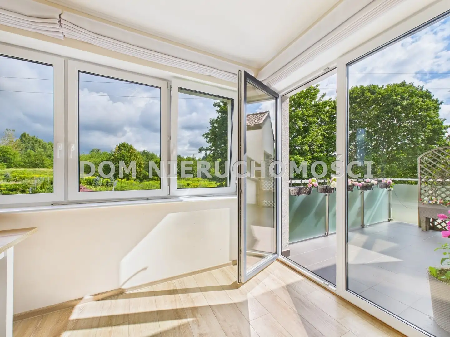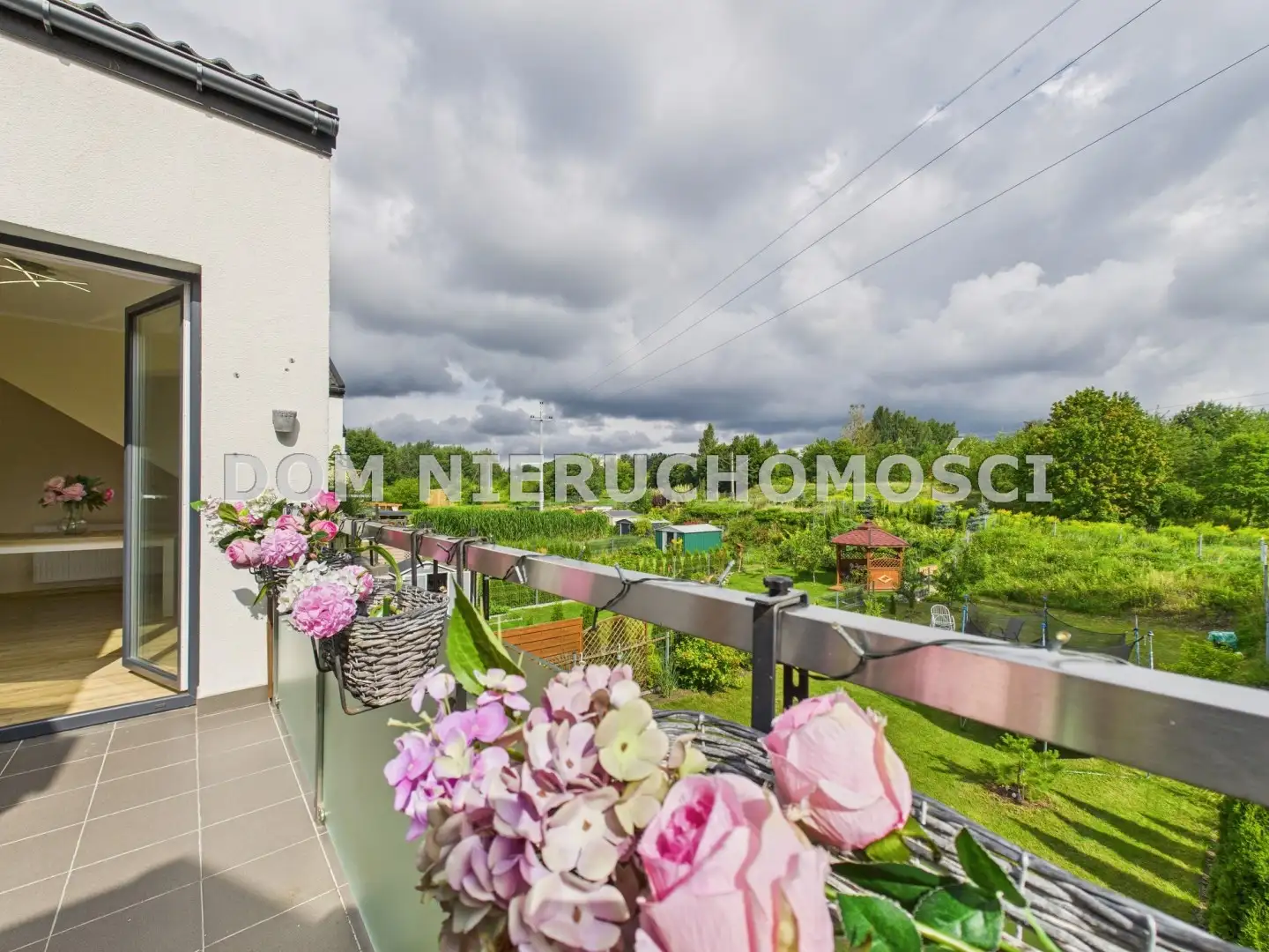 Z salonu i jadalni wyjście na duży balkon z pięknym widokiem na działki sąsiadów i zieleń.