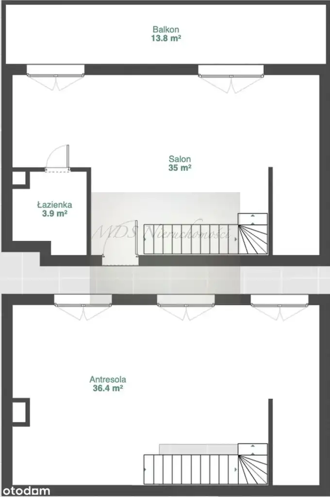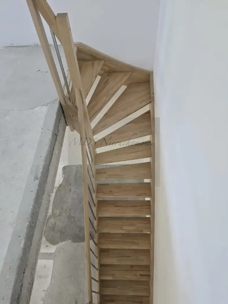 na drugi poziom prowadzą drewniane schody wykonane na zamówienie, można tam urządzić sypialnie oraz łazienkę.