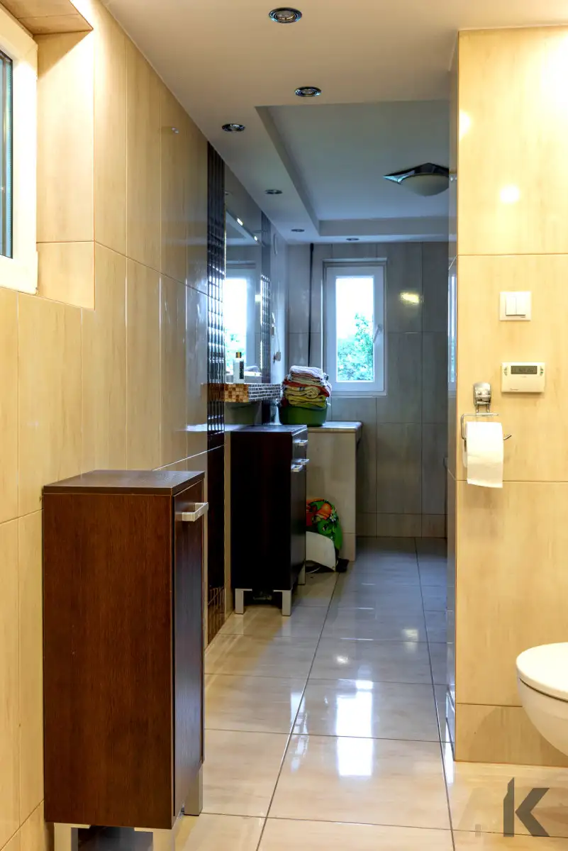 Dom składa się z 3 przestronnych pokoi, 2 w pełni wyposażonych łazienek i jasnej, widnej kuchni z pełnym umeblowaniem w zabudowie i sprzętami AGD (lodówka, zmywarka, piekarnik, mikrofalówka, okap, płyta grzewczo-gazowa). Komfort użytkowania zapewniają panele na podłogach i nowoczesne rozwiązania, takie jak klimatyzacja, kominek nadający wnętrzu ciepła i przytulności, a także podgrzewane podłogi w łazienkach. Wnętrza są jasne i funkcjonalnie zaprojektowane. Dom posiada użytkowe poddasze, które pełni funkcję dodatkowej przestrzeni. Budynek posiada piwnicę z oknami i pomieszczenie gospodarcze.