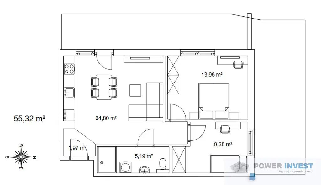 Mieszkanie znajduje się na parterze. Lokal ma powierzchnię 55,32 m powierzchni użytkowej i składa się z: