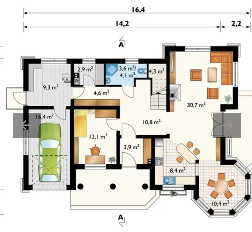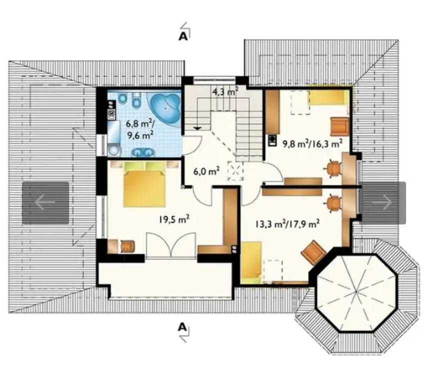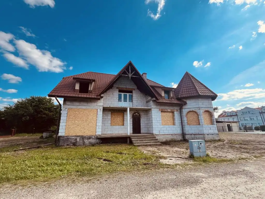 Na parterze znajduje się kuchnia, jadalnia, salon, łazienka, dodatkowy pokój, kotłownia i garaż jednostanowiskowy. Na piętrze są trzy ustawne pokoje, w tym jeden z wieżyczką, łazienka i dodatkowy korytarz z wyjściem na ogromny balkon/taras.