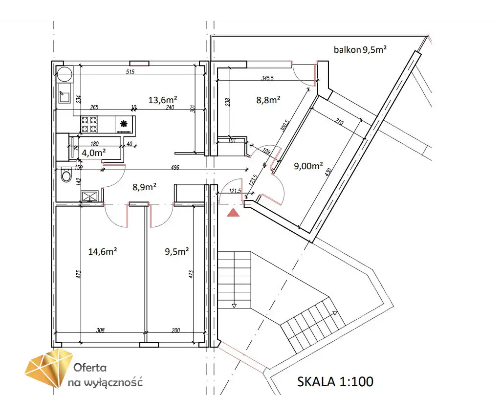 - pokój o pow. 8,80m² z wyjściem na balkon o pow. 9,50m²,