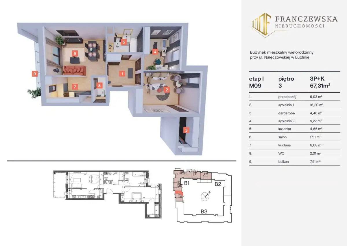 Dwustronne, trzypokojowe mieszkanie o powierzchni projektowej 67,31 m² z wystawą okien na północny-wschód i południowy-zachód.
