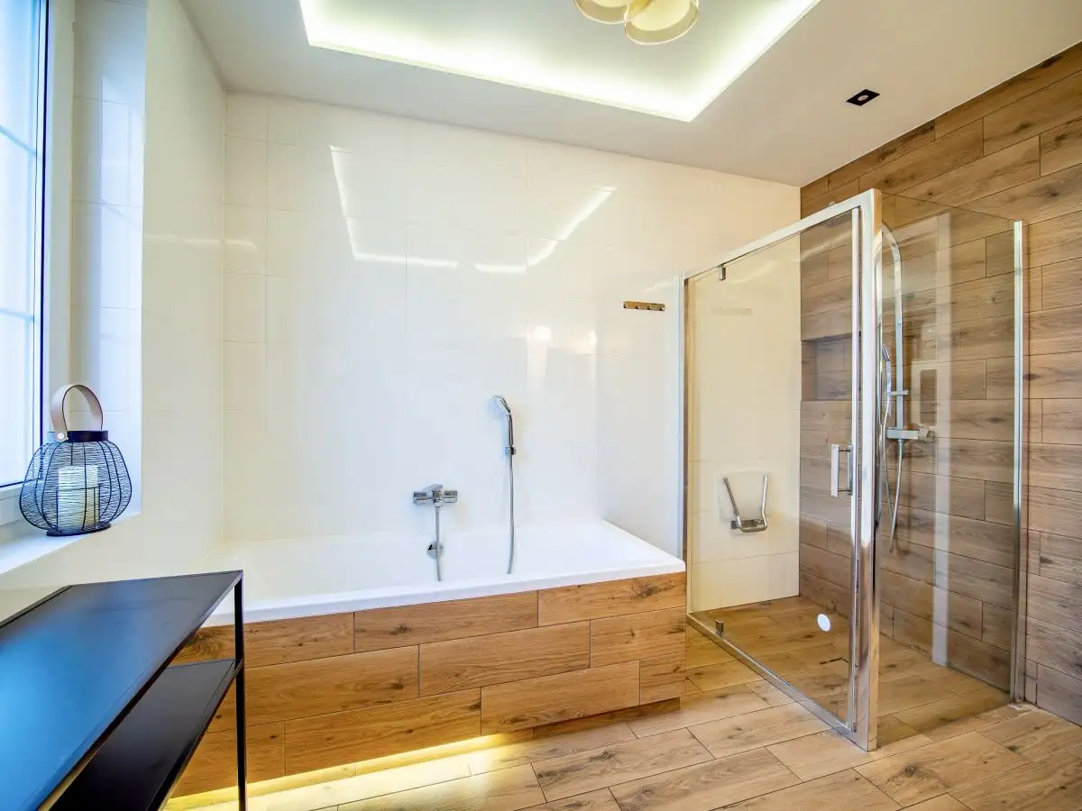Na tym poziomie znajduje się również wiatrołap o powierzchni 3,80 m², kotłownia zajmująca 6 m², hall o powierzchni 6,60 m², a także łazienka o metrażu 9,60 m². Dodatkowy pokój o powierzchni 16 m² może pełnić funkcję sypialni lub gabinetu. Na piętrze znajduje się jeszcze jeden pokój o powierzchni 15 m², który świetnie sprawdzi się jako sypialnia lub przestrzeń do pracy.
