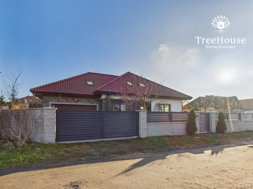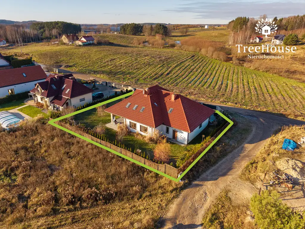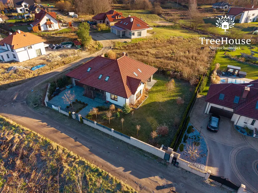 Działka o powierzchni 1111 m² jest w pełni ogrodzona murowanym płotem z metalowymi przęsłami oraz siatką. Wjazd na posesję odbywa się przez stalową bramę. Podjazd do garażu, ścieżki wokół domu i taras wyłożone są kostką brukową. Teren jest zagospodarowany i obsadzony roślinnością, a dojazd prowadzi drogą utwardzoną.