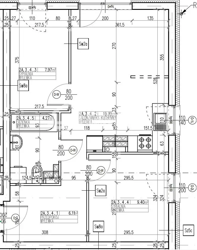 Układ: salon z aneksem kuchennym + 2 sypialnie + łazienka