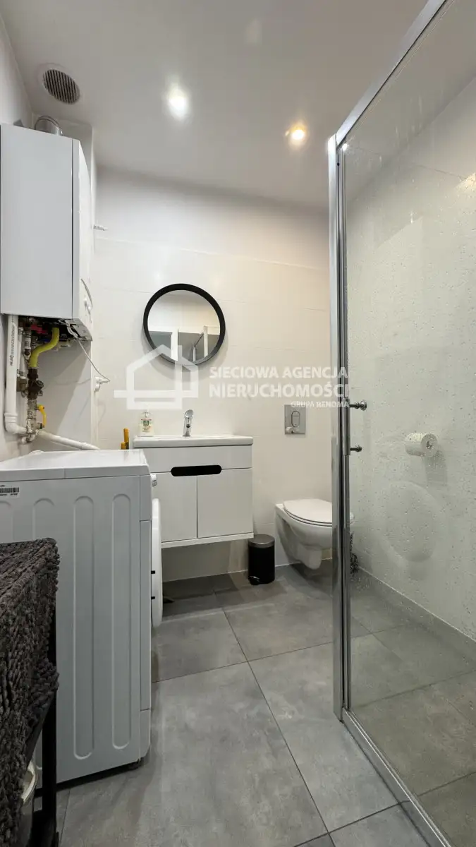 mieszkania wchodzi salon z jadalnią i aneksem kuchennym, sypialnia z szafą, łazienka z kabiną prysznicową i WC oraz przedpokój.